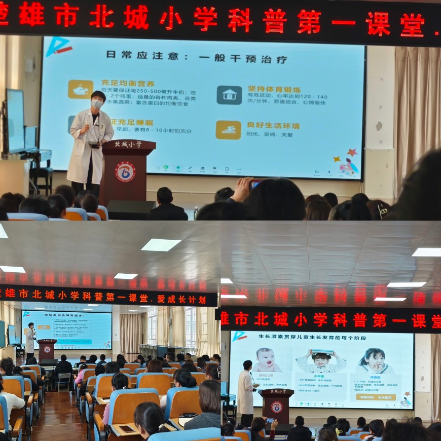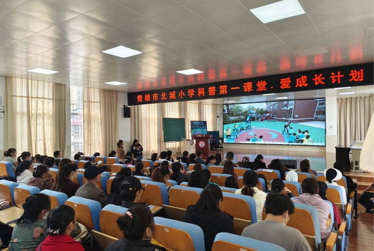 2021年,中国儿童少年基金会启动“第一课堂·爱成长计划”公益项目,相继在北京、广东、山东、云南、浙江、陕西等地,面向儿童及其家庭,以线上线下相结合的形式,开展儿童健康相关科普课堂和咨询、义诊等活动,逾30万儿童及其家庭受益,取得了良好的社会效果。为更好贯彻《中国儿童发展纲要2021至2030》精神,促进儿童身心健康,在北城小学校本部开展“第一课堂·爱成长计划”楚雄州家长科普课堂。此次活动由北城小学刘芮弛副校长主持,北城小学校本部一年级的184名家长参与。活动分两项议程进行:首先是观看“第一课堂·爱成长计划”公益项目宣传片,然后由楚雄州人民医院邱恒逵医师为大家讲授《生长发育》主题科普讲座。