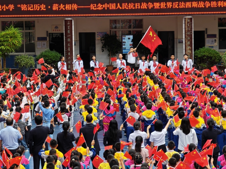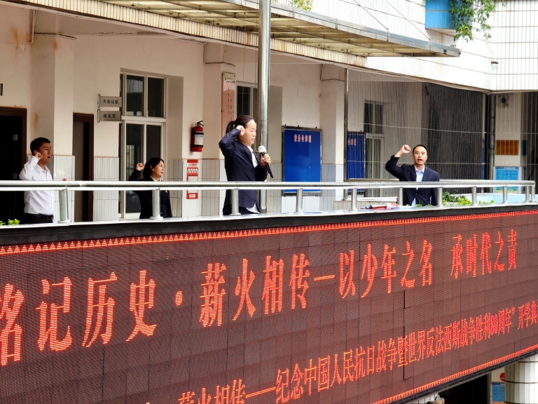 学校领导的致辞中深情回顾了抗日战争暨世界反法西斯战争的艰难历程,详细阐述了胜利的重大意义。这段历史记录了中华民族的苦难与辉煌。那些先烈的牺牲,不是为了让我们记住仇恨,而是为了让我们懂得“和平来之不易”传承“不屈不挠”的精神,铭记历史,才能守住民族的精神根基。