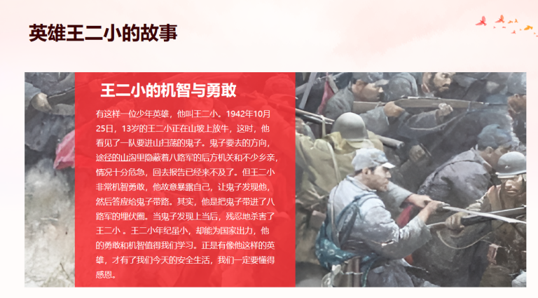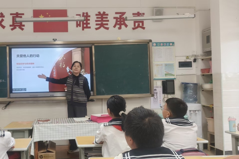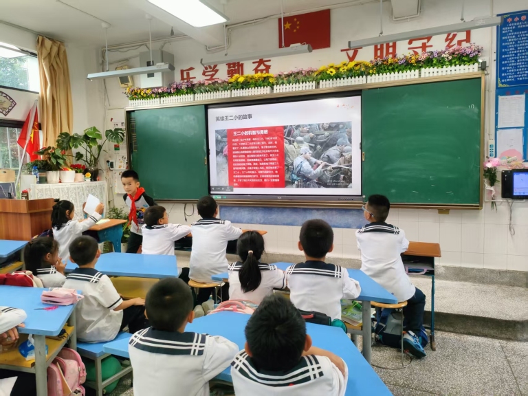 随后,“英雄故事汇”环节点燃了全场的热情。少年英雄王二小在放牛时机智勇敢地与日寇周旋、用年轻的生命守护乡亲与八路军的故事,让同学们屏息凝神;抗日女英雄赵一曼面对敌人的残酷折磨坚贞不屈,在刑车上给儿子写下“母亲是为国而牺牲”这封感人至深的绝笔家书时,不少孩子的眼眶都湿润了。老师顺势将英雄精神提炼为“勇敢、坚持、关爱”三个关键词,孩子们纷纷举手分享自己的感悟:“遇到难题不放弃就是坚持!”“主动帮同学捡文具就是关爱!”