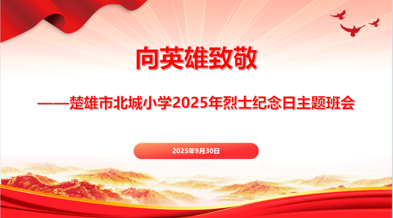 山河已无恙,英雄永垂不朽。 在2025年9月30日烈士纪念日来临之际,楚雄市北城小学紧扣“向英雄致敬”主题,精心组织了一堂浸润心灵、传递力量的主题班会。红色基因的种子,在孩子们心中悄然扎根、向阳生长。