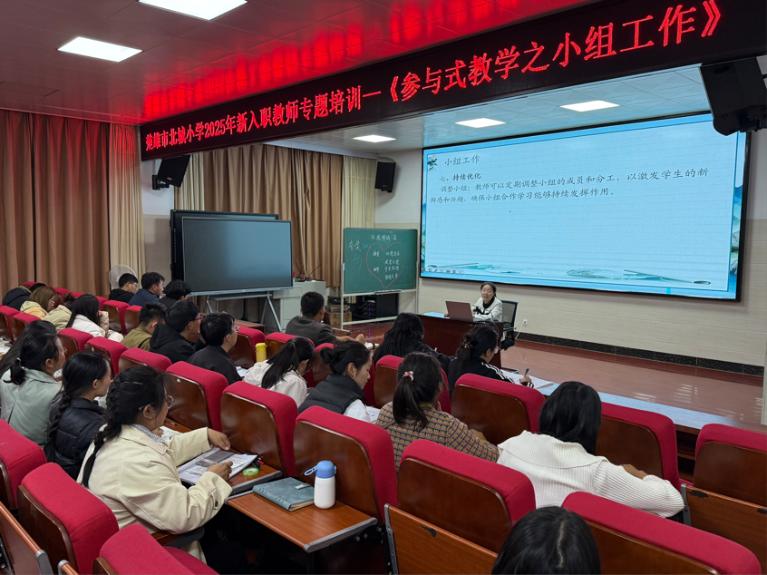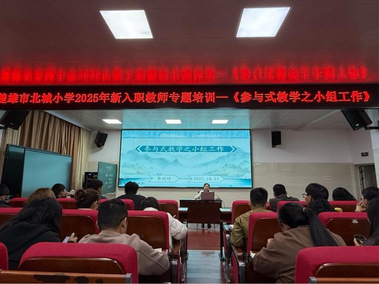 为深化课堂教学改革,提升新入职教师的专业素养与课堂组织能力,助力其快速成长,2025年10月23日,楚雄市北城小学在南路校区报告厅成功举办了以“参与式教学之小组工作”为主题的新入职教师专题培训会。本次培训旨在探索高效课堂模式,切实减轻教师负担,将学习的主动权还给学生。