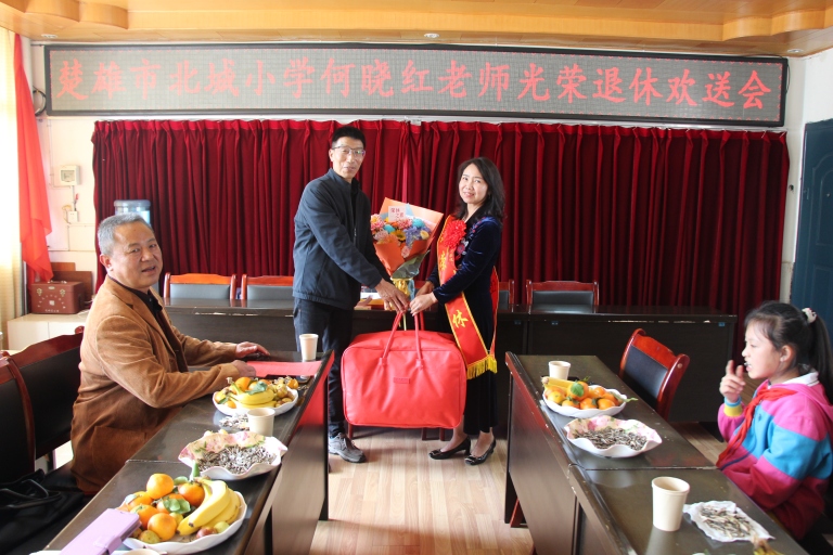 随后,李兴华校长为何晓红老师致欢送辞,颁发退休证、授予纪念牌,刘增爱副校长为何老师佩戴红花,周丕先副校长送上纪念品,学生代表张芳菲献上鲜花致敬恩师,诉说对何老师的感恩之情。