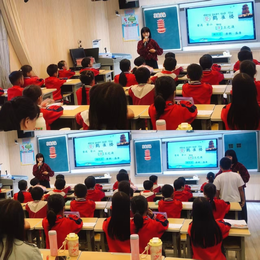 杨淑娟老师以单元导语为切入口,以形象直观的象形字引入标题,巧妙衔接,紧而有序。在导学环节,通过初遇古诗读中识字、深入诗境感知诗意、登楼望远品味哲理三个活动的设计,学生们根据任务要求进行学习,在老师的引领下逐一解决困惑。在本节课中,我们感受到了丰富多样的识字形式,而在较难诗句的理解上,借助诗画相融和情景创设的方式,从而达到诗境还原和诗情体味的教学效果。在课外拓展上又别出心裁,以AI模拟王之涣登楼望远的情境为引,给老师们提供了古诗词积累运用的新思路。