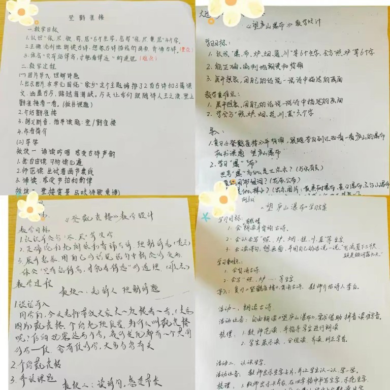 本次备课活动共分为三次备课:个人备课、第二次集体备课、第三次集体备课。备课内容分别为新村镇中心小学主备《望庐山瀑布》,大地基乡中心小学主备《松鼠》。老师们从新课程标准、单元主题、语文要素、教学重难点等角度书写了自己的教学设计,个人备课是独特个体教学风格的展现。一字一句是老师们的教学想法,沙沙写字声,是老师们的教学智慧结晶。三千思绪,化诸笔端,老师们在纸上诉说自己的教学蓝图。