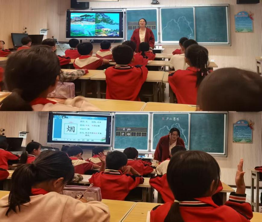 行,必能到达;学,必有所获!10月31日,苏老师带领二(2)班的小朋友走进《望庐山瀑布》的教学。从古诗揭题到阅读古诗并识字,苏老师注重语文基础能力训练,教给二年级小朋友阅读古诗的方法,教学注重由浅入深,通过边阅读,边想象画面,感受诗人的浪漫风格,进一步在充满想象力的诗歌中体会诗歌的魅力。“纸上得来终觉浅,绝知此事要躬行”,跟随诗歌律动视频,孩子们边吟诵古诗,边做手势舞,从玩中学,从做中学,极大激发了孩子们的学习兴趣和好奇心。