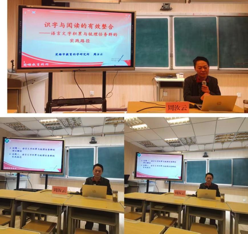 山高自可登临上,水深不妨涉足知。针对小学语文教学中如何实现识字与阅读的有效整合,楚雄市教科所周汝云副所长,站位高、定位准,根据新课标的内涵——落实学生的核心素养为落脚点,从“语言文字积累与梳理任务群的理论解析”和“语言文字积累与梳理任务群的实施路径”两大话题,开展了“识字与阅读的有效整合——语言文字积累与梳理任务群的实施路径”的专题讲座。讲座中,周副所长系统解析该任务群的核心理论,指出识字是阅读的基础,阅读是识字的延伸,并结合教学实例,应注意的事项,提出“随文识字强关联”“阅读梳理促内化”等实施路径,为教师打通识字与阅读壁垒,提升学生语文核心素养提供实践指导。“拨开云雾见月明,静待花开终有时”周副所长的讲座既有理论高度,又具实操性,为教师破解识字与阅读脱节难题提供清晰方向。