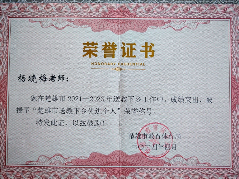 2.从教二十五年,先后荣获省级、县级、校级优秀支教教师称号,2次获评楚雄市优秀教师、楚雄市送教下乡先进个人,多次被评为校级优秀班主任、优秀教师、教学能手。