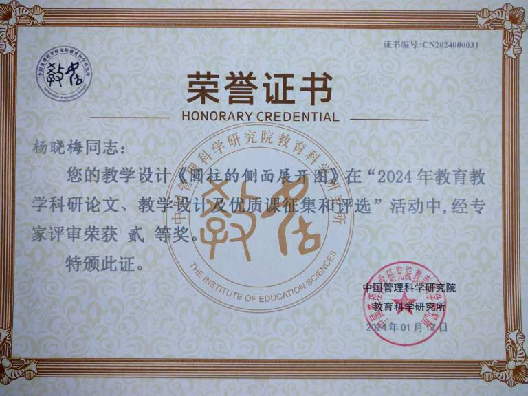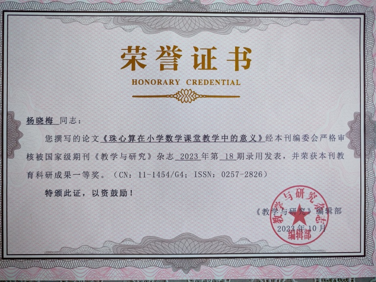 2.2016年参加楚雄市小学数学课堂教学竞赛获二等奖,多次参加校级课堂教学竞赛获一等奖;撰写的多篇论文、教学设计分获国家级、省级、州级一、二等奖,其中1篇论文在国家级期刊《教学与研究》发表;辅导学生参加云南省珠心算比赛获团体三等奖,并获优秀教练奖。