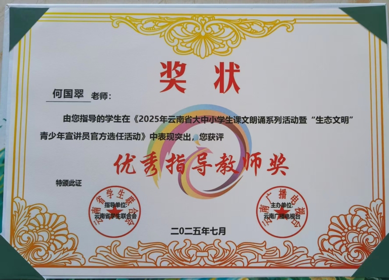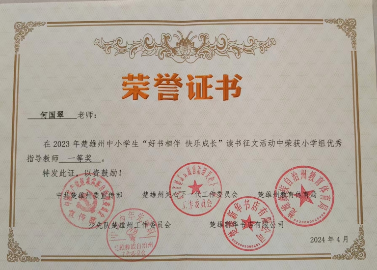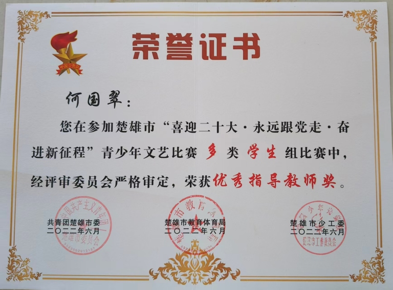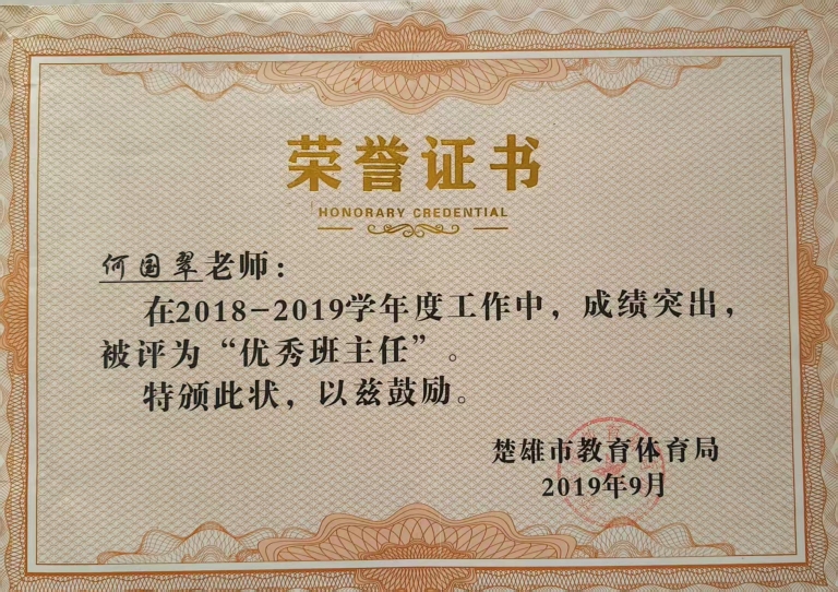 2.从教二十多年,荣获“省级优秀支教教师”称号,先后评为“市级优秀班主任”、“市级优秀教师”;在指导学生竞赛方面,累计获得6次省级“优秀指导教师奖”、2次州级“优秀辅导教师奖”、11次市级“优秀辅导教师奖”。此外,她还多次获评得校级优秀班主任、教学能手、巾帼标兵等荣誉称号。