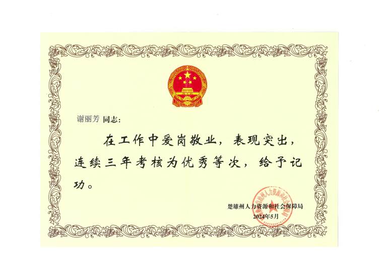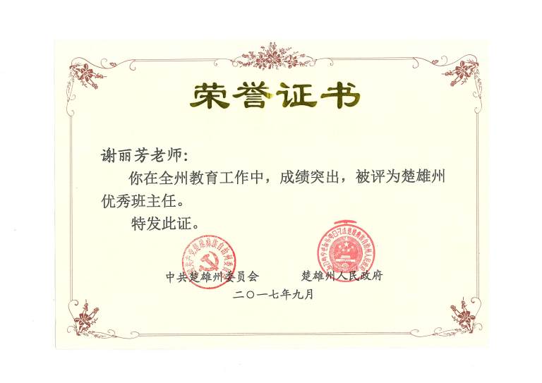 2.多年来的辛勤付出换来诸多荣誉。荣获“楚雄州优秀教师”“楚雄州优秀班主任”,“记功”1次,2次荣获“楚雄市优秀班主任”,1次荣获“楚雄市优秀骨干教师”,多次被学校表彰为“优秀教师”“优秀班主任”“教学能手”。班级管理成果显著,所带的2019级3班被共青团楚雄州委、楚雄州少工委表彰为“红领巾奖章”三星章和四星章,展现了卓越的教育教学和班级管理能力。