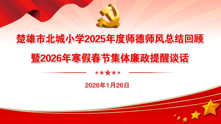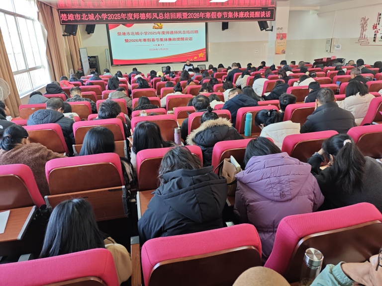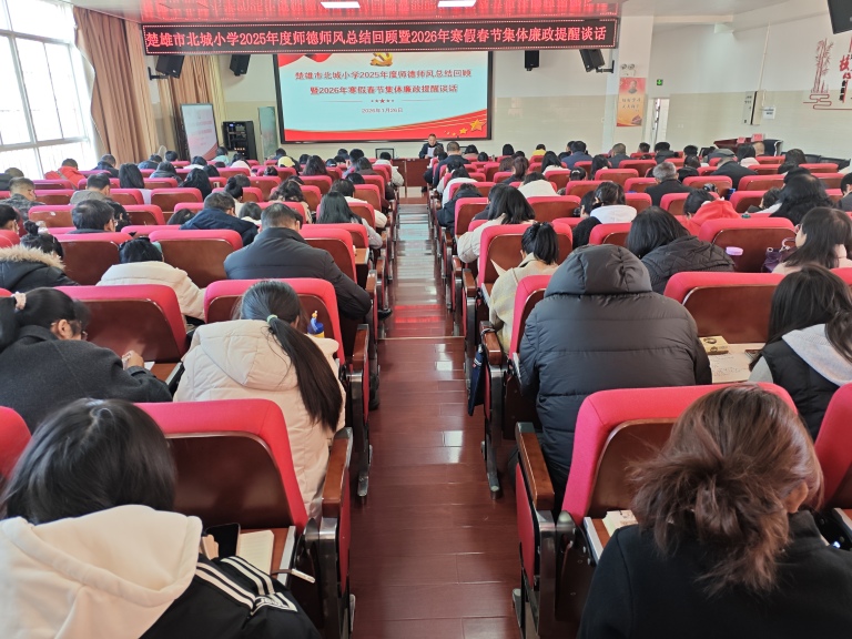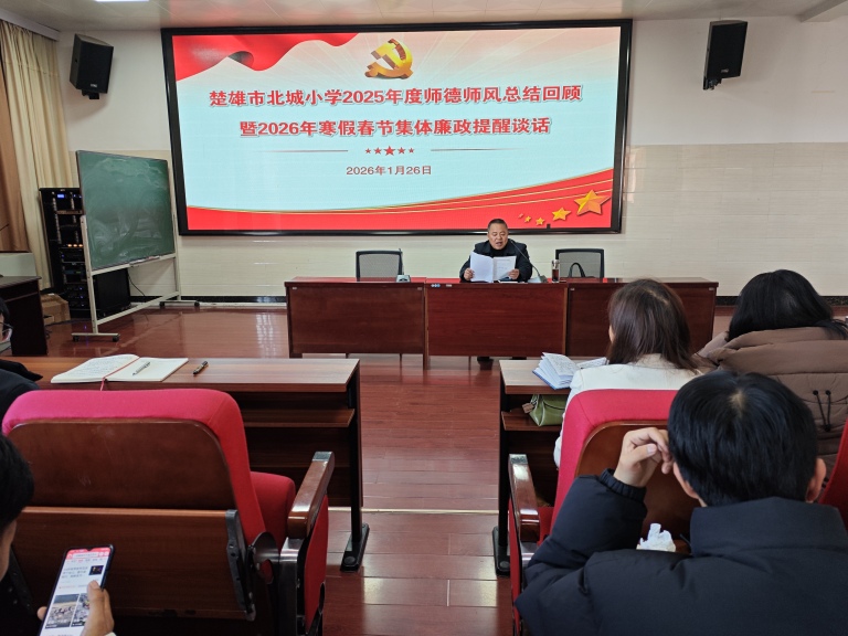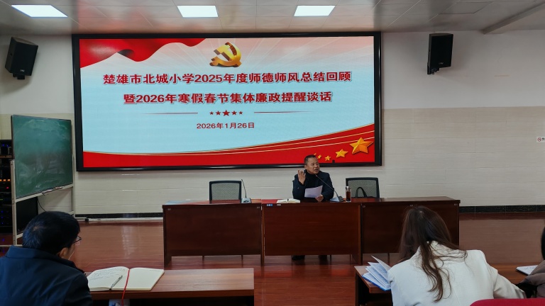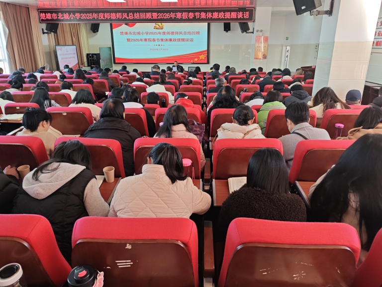 2026年1月26日,北城小学在报告厅隆重举行2026年寒假春节前集体廉政提醒谈话暨1月主题党日活动,活动由党总支副书记、校长李兴华主讲,全体教师齐聚一堂,共同接受廉政教育,强化纪律意识,为度过一个廉洁、祥和、安全的春节假期筑牢思想根基。李校长以《风清气正度寒假 廉洁自律迎新春》为主题,从五个方面进行廉政集体谈话。