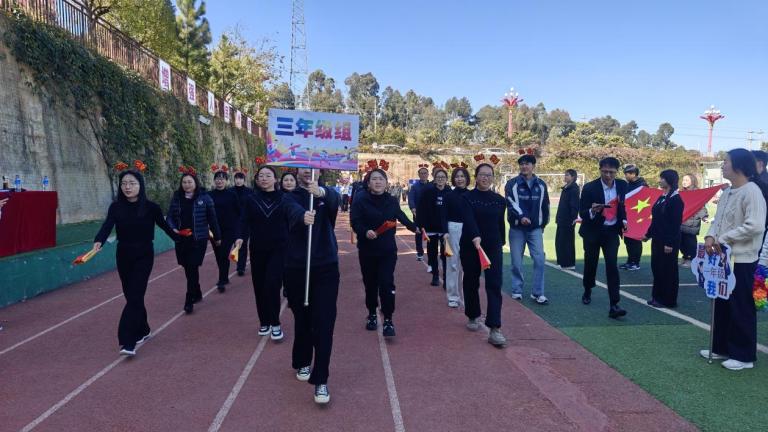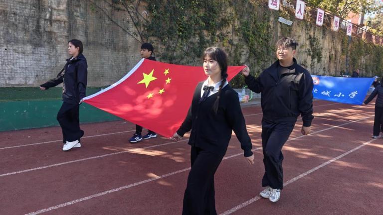 伴随着激昂的旋律,教师代表组成的国旗队、校旗队步伐铿锵,庄严入场;随后各年级教师方阵依次走过主席台前,手持特色标志牌,高喊嘹亮口号,步伐整齐、精神抖擞,尽显北城小学教职工团结协作、奋发向上的风采。