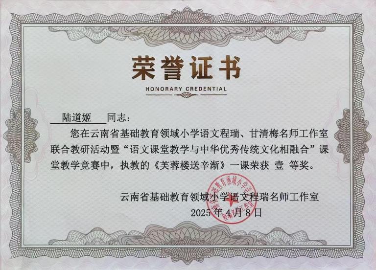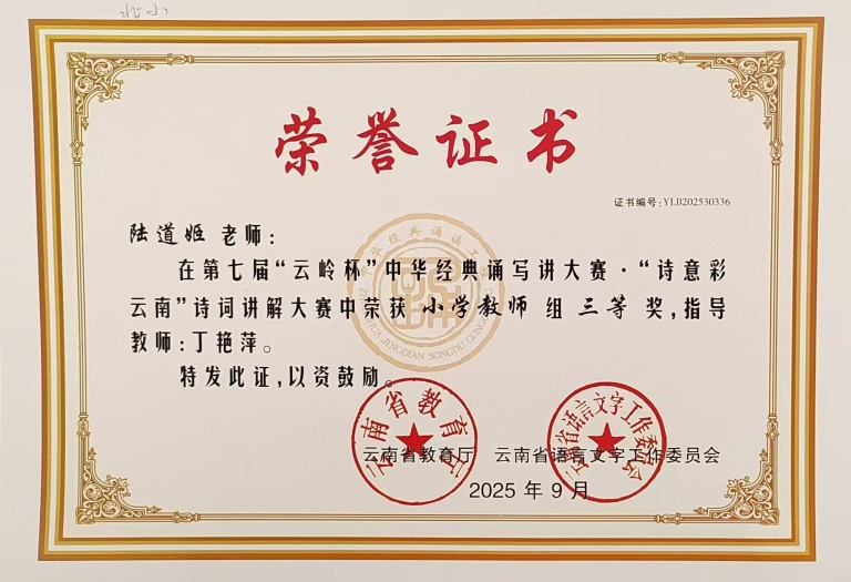 1.深耕教坛屡摘桂,教研赛课绽芳华。第七届“云岭杯”中华经典诵写讲大赛."诗意彩云南"诗词讲解大赛中,荣获小学教师组三等奖;道德与法治课入选2025年云南省“好课堂”教学案例;云南省基础教育领域程瑞名师工作室语文课赛一等奖;楚雄州道德与法治课赛一等奖;楚雄市道德与法治、语文课堂竞赛一等奖。另有20余篇论文、教学设计荣获国家、省级奖。