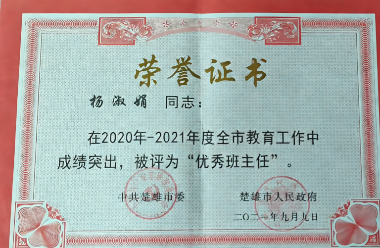 2.从教26年来,斩获各级各类表彰,荣获“市级中小学骨干教师”,多次被评为”市级优秀班主任”、“市级优秀辅导员”,屡次荣获学校“教学能手”、“优秀教师”、“巾帼建功标兵” 等称号,以实际行动诠释了新时代教师的责任与担当。