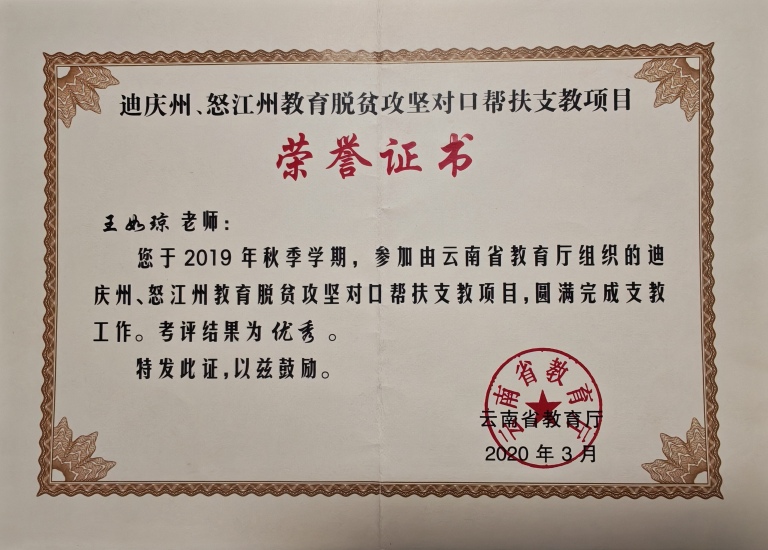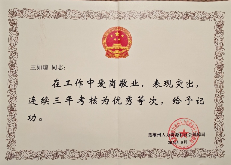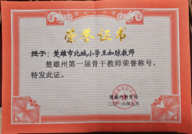 2.从教26年来,斩获各级各类表彰, 云南省“迪庆州、怒江州对口帮扶支教”优秀教师;迪庆州维西县“支教优秀工作者”。楚雄市优秀教师、优秀班主任、送教下乡优秀工作者。楚雄州人力资源和社会保障局授予“记功”奖章,北城小学“优秀班主任”“优秀教师”“教学能手”“优秀少先队辅导员”“巾帼建功标兵”等校级荣誉50余次。