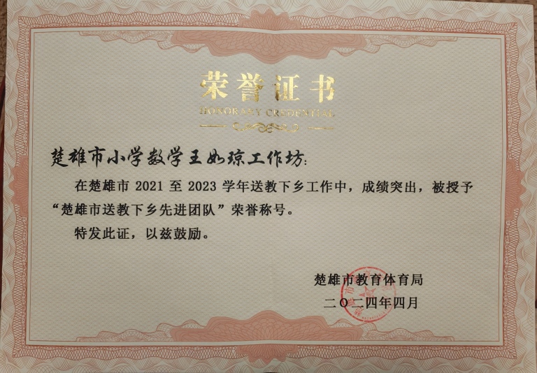 王老师积极参与各级教学研讨与教师培训工作,承担州、市级课赛,示范课、专题讲座、课赛评委、教师招录考官、教师资格证面试考官等任务60余场。2019年,她主动响应云南省教育厅号召,赴迪庆州维西县支教一学期,开展示范教学、教师培训、教研指导等活动,助力边疆教育发展,被评为省级“对口帮扶支教优秀教师”,维西县“优秀支教工作者”。2016年至今,连续9年成为国培计划——楚雄市送教下乡与校本研修团队成员、楚雄市送教下乡活动小学数学工作坊坊主、 成员,曾连续两届成为楚雄州省级小学数学名师工作室成员,并成立“王如琼工作组”,带领青年教师共同成长。2024年,担任“国培计划”送教下乡工作坊坊主,被评为“优秀送教个人”“优秀团队坊主”,辐射引领作用显著。