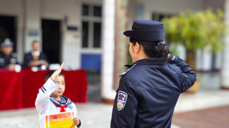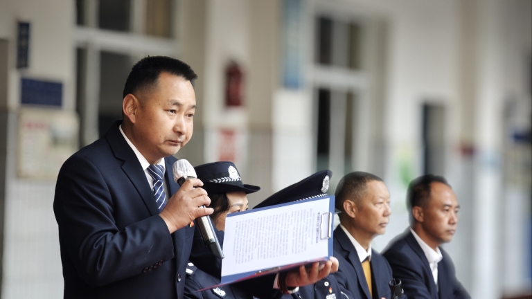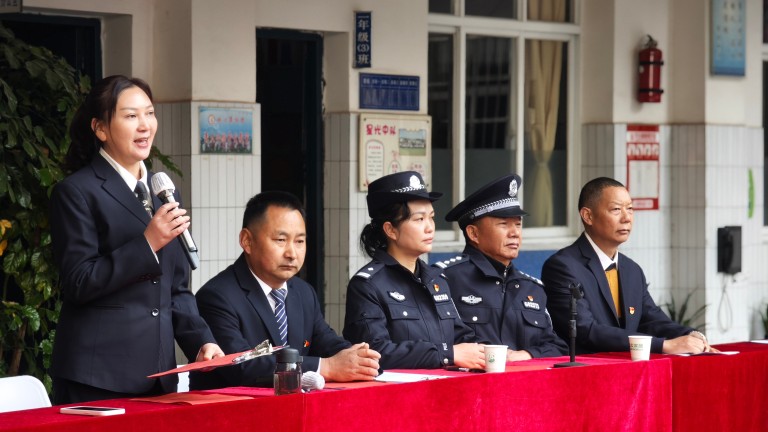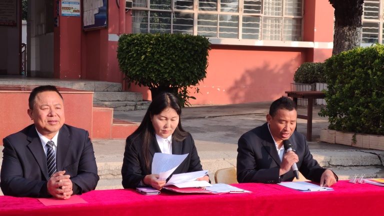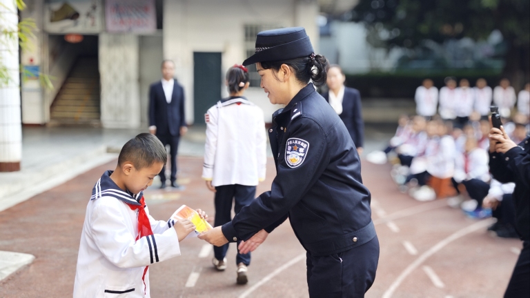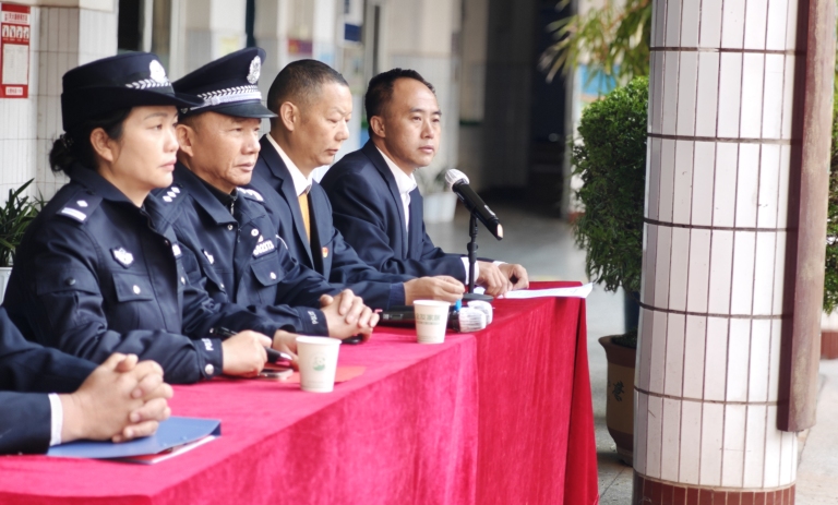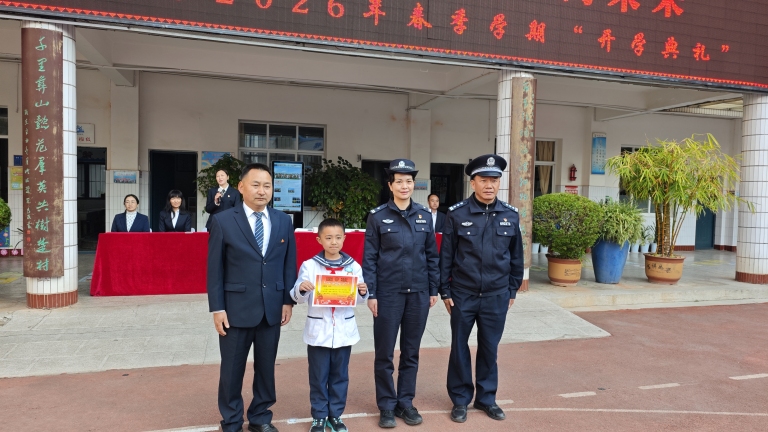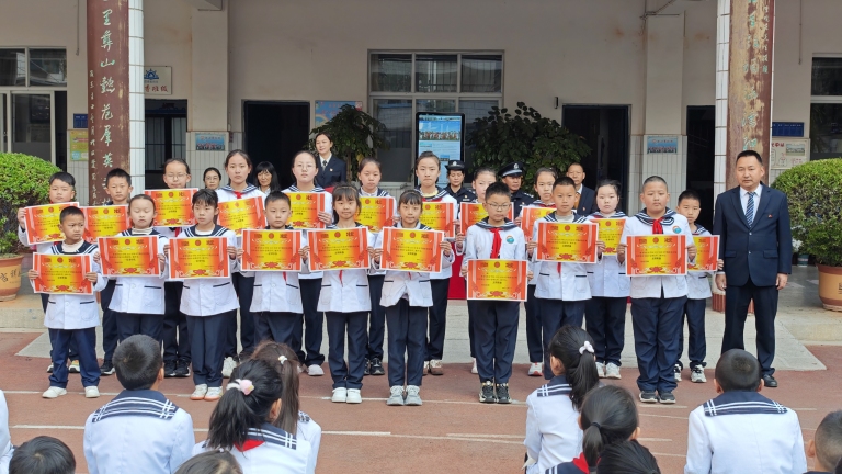 首先由何应明书记宣读《关于表扬夏紫然同学拾金不昧行为的通报》,接着楚雄市西城派出所副所长王连群为夏紫然同学颁发奖状并合影留念,并对全体师生开展安全教育。