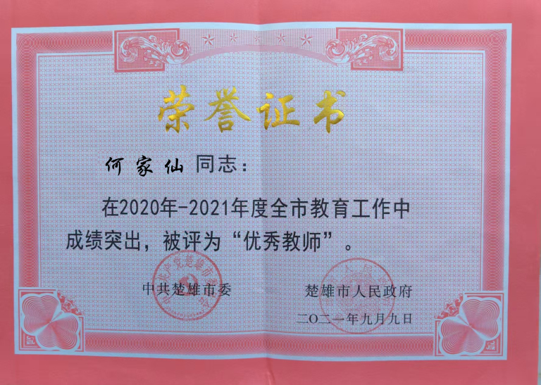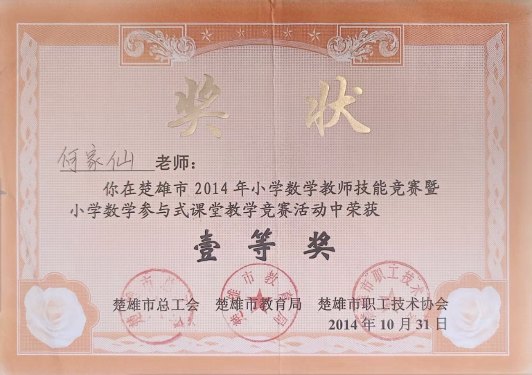 何家仙老师政治立场坚定、恪守教师职业道德,始终以高标准严格要求自己,把思想政治教育融入日常教学与管理。因工作实绩突出,获评楚雄市“优秀教师”,楚雄市送教下乡“先进个人”等多项荣誉。连续多年获评北城小学“优秀班主任”“优秀教师”“教学能手”“巾帼建功标兵”称号,荣誉既是肯定,更是责任,激励她以更高标准履职尽责,做学生为学、为事、为人的示范。