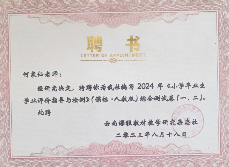 何家仙老师深耕小学数学教育一线多年,专业功底扎实、育人情怀深厚。具备丰富的命题与评价经验,形成独特的教学风格。2023年受聘参与编写《云南课程教材教学研究》杂志社小学毕业学业评价与检测(数学),体现了专业认可度。同时,多次担任教师招录考官、教师资格证面试考官,严格标准、公正履职,以专业能力守护教师队伍入口质量,业务能力与综合素养得到同行与主管部门充分肯定。在教学教研中,作为长期教研组长,她牵头组织集体备课、课例研讨、质量分析,带动教研组整体提升,主持并参与多项教研课题,“以研促教、以研提质”,把研究成果转化为教学实效。撰写的多篇教育教学论文和教学设计,荣获省级、州级一、二等奖;2014年参加市级课堂教学竞赛获一等奖。