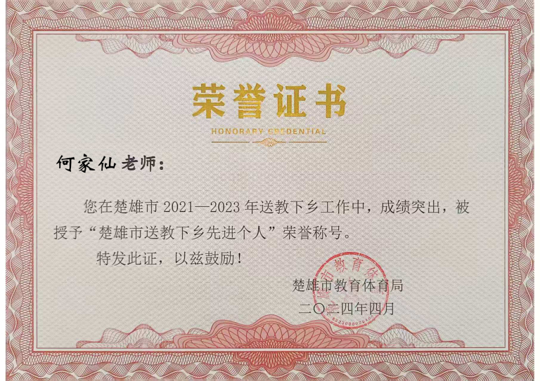 何家仙老师作为市级优秀教师,她充分发挥示范、辐射、引领作用,多年以来,积极承担送教下乡、公开课、专题讲座等任务,把优质资源与成熟经验分享给基层教师与青年教师,被评为楚雄市送教下乡“先进个人”。在教研团队中,她悉心指导青年教师备课、磨课、做课题,帮助青年教师快速成长,形成“传帮带”的良好氛围。通过送教下乡、城乡教研联动,推动城乡教育资源互通,助力薄弱学校提升教学水平。