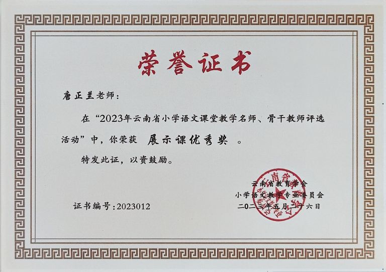 深耕小学语文教学一线,注重语言积累与思维发展并重,强调情感体验与价值塑造同行。曾荣获云南省小语学会“展示课优秀奖”,在市级小学语文、道德与法治课堂教学竞赛中斩获一等奖;她善于总结教学经验,撰写论文与教学设计累计获国家级、省级一、二等奖20余项。她指导学生参加征文比赛,2020年获人民文学出版社《学语文之友》征文活动“优秀指导教师”称号,多次荣获省级、州市级“优秀指导教师”荣誉。