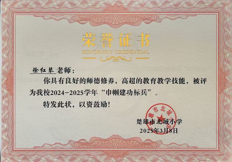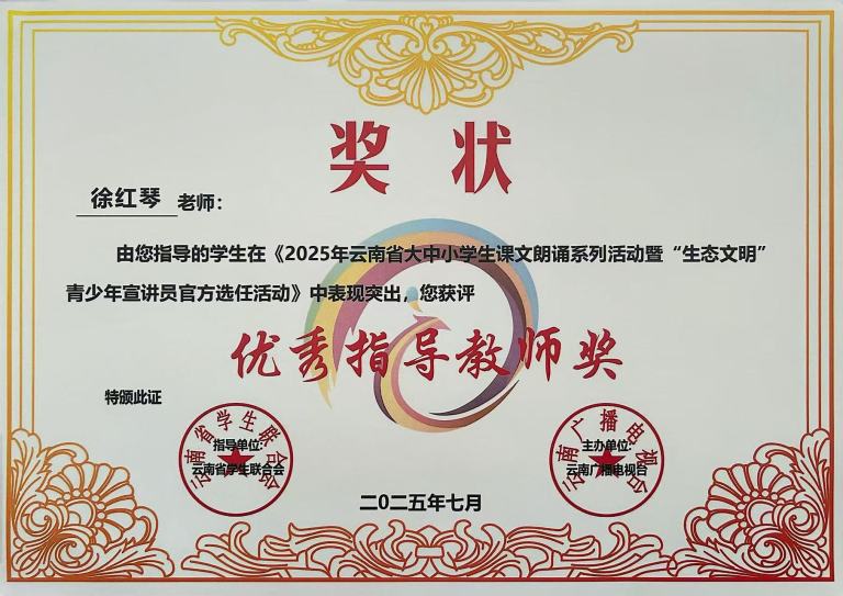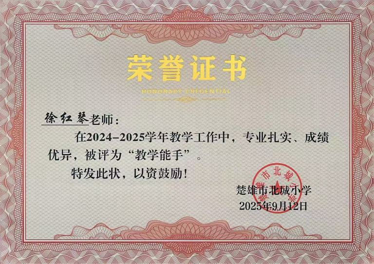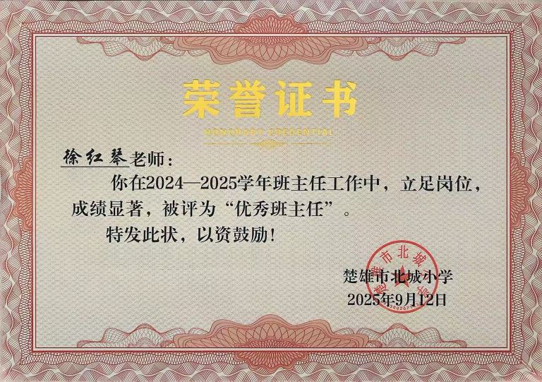 她始终坚守立德树人初心,拥护党的教育方针,将爱国情、报国志融入日常教学与班级管理之中。她踏实肯干、严于律己、以身作则,先后荣获市、镇、校各级“德育先进工作者”、“优秀班主任”、“优秀少先队辅导员”、“优秀教师”、“教学能手”、“巾帼建功标兵”等荣誉称号,把教书育人的初心落实在每一堂课的细节里,用踏实与真诚浇灌每一株幼苗的成长。
