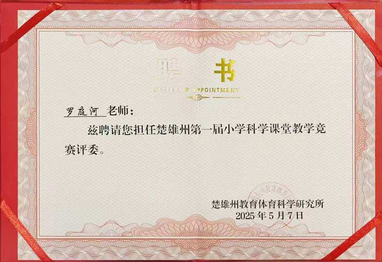 作为楚雄州小学科学名师工作室核心成员,主动承担青年教师培养工作。通过“师徒结对”“同课异构”等形式,指导多名年轻教师优化教学设计,其中 3人在市级教学竞赛中斩获佳绩。2025年担任全州科学课堂教学竞赛评委期间,我深入点评参赛作品,提出 “问题导向型课堂设计”建议,推动赛事质量提升。同时,在校内组织科学教研组定期开展专题研讨,分享教学心得,带动团队整体教学水平跃升,所在教研组连续两年被评为“优秀教研集体”。