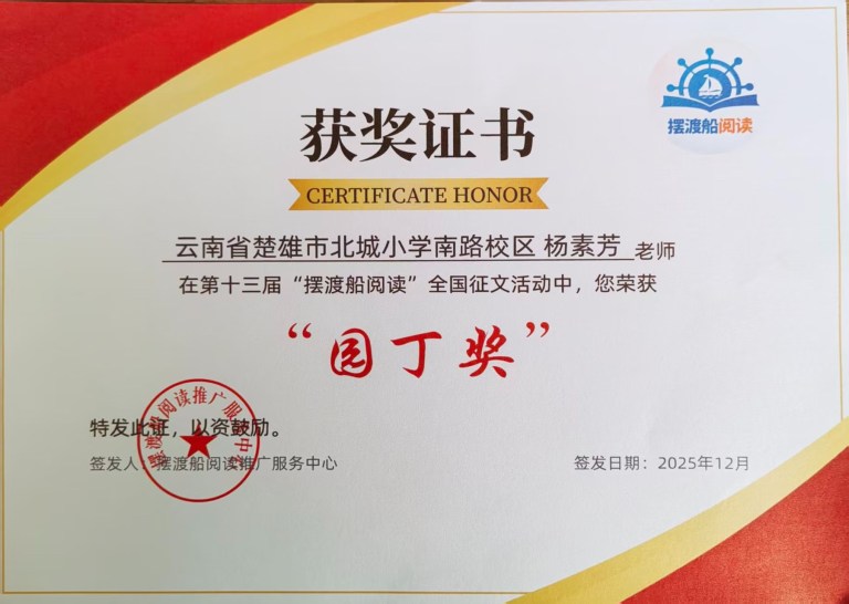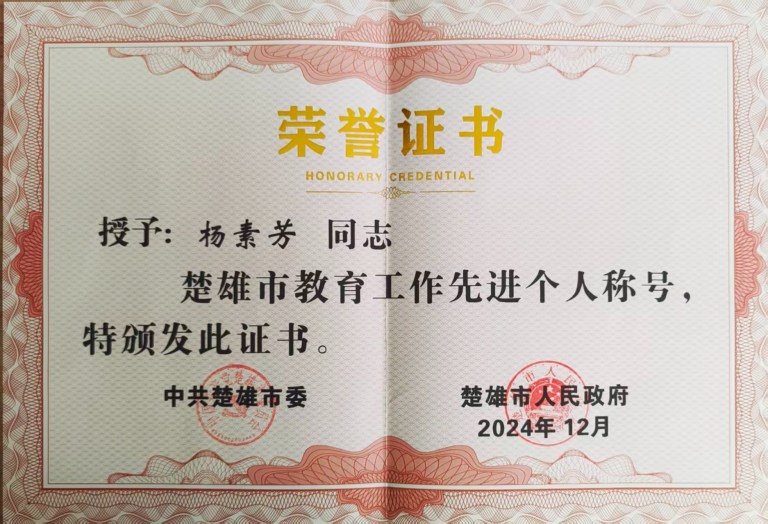 “为师先做人,育人先正己”,这是杨老师始终坚守的教育准则。从教以来,她始终保持对教育事业的赤诚热爱,把个人成长融入学校发展,把岗位担当化作争先动力。在教学上争一流,在管理上求实效,在育人上用真心,在教研上敢创新,以实际行动践行教育初心,以优异成绩展现新时代教师风采。她恪守师德规范,以高度的责任心投入教育教学,用真情温暖学生,用道理引导学生。面对不同性格、不同基础的学生,她始终秉持“不放弃每一个学生”的信念,注重在日常教学与生活中渗透价值观教育,帮助学生树立正确的世界观、人生观、价值观,让“立德树人”的种子在学生心中生根发芽。先后曾被中共楚雄市委、市人民政府授予“教育工作先进个人”“优秀少先队辅导员”“优秀班主任”“优秀教师”称号;所带中队被共青团楚雄市委、市教育局、市少工委授予“少先队楚雄市红旗中队”称号。