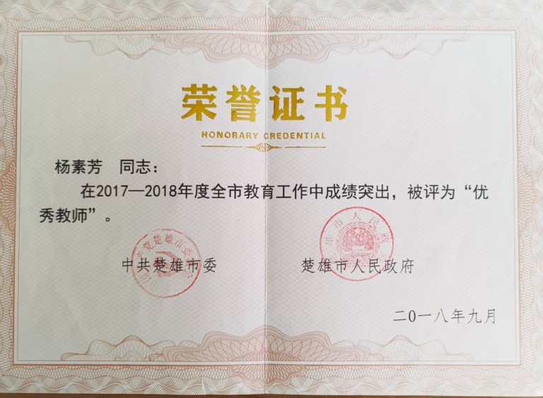 杨老师坚信“没有爱就没有教育”。在29年的教学生涯中,担任班主任28年,教育教学成绩稳居同级同类学校领先水平。多次参加镇级、校级课堂教学讲赛和各种业务竞赛成绩优异。承担过“国培计划”——楚雄市送教下乡授课任务,是楚雄州第二届小学名班主任少先队辅导员苏雁工作室成员兼片区组长。曾参加校级师德师风演讲比赛、廉洁文化书画作品比赛、教师综合素质赛成绩优异,多篇的教育教学论文曾获国家级、省级、州市级奖励,多次被评为镇校级“师德标兵”,“优秀教师”、“优秀班主任”,“优秀辅导员”、“巾帼建功标兵”“教学能手”“优秀指导教师”,辅导学生参加各级征文比赛,科技创新大赛多次获奖。