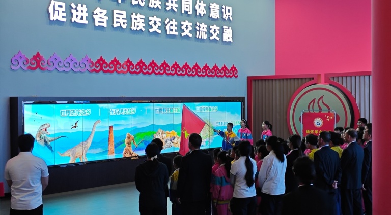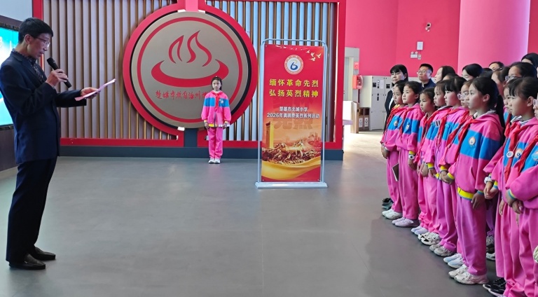 在博物馆讲解员的带领下,师生们循着历史脉络,驻足于珍贵的历史图片、文献资料和实物展陈前,系统学习中国共产党在楚雄地区的革命斗争史、建设发展史与改革开放成就。一件件承载岁月记忆的文物,一段段震撼人心的英烈故事,让大家深刻感悟到革命先辈为理想信念不懈奋斗的崇高精神,也让清明节缅怀先烈的家国情怀在每个人心中深深扎根。活动现场,党员教师面向党旗庄严重温入党誓词,铿锵有力的誓言在展厅回荡,彰显着党员教师传承英烈精神、勇担育人使命的坚定决心;少先队员们整齐列队,齐唱《中国少年先锋队队歌》,稚嫩却坚定的歌声,传递着少年儿童赓续红色血脉、争做时代新人的赤诚之心,誓言与歌声交织,谱写了一曲清明缅怀、信仰传承的时代乐章。