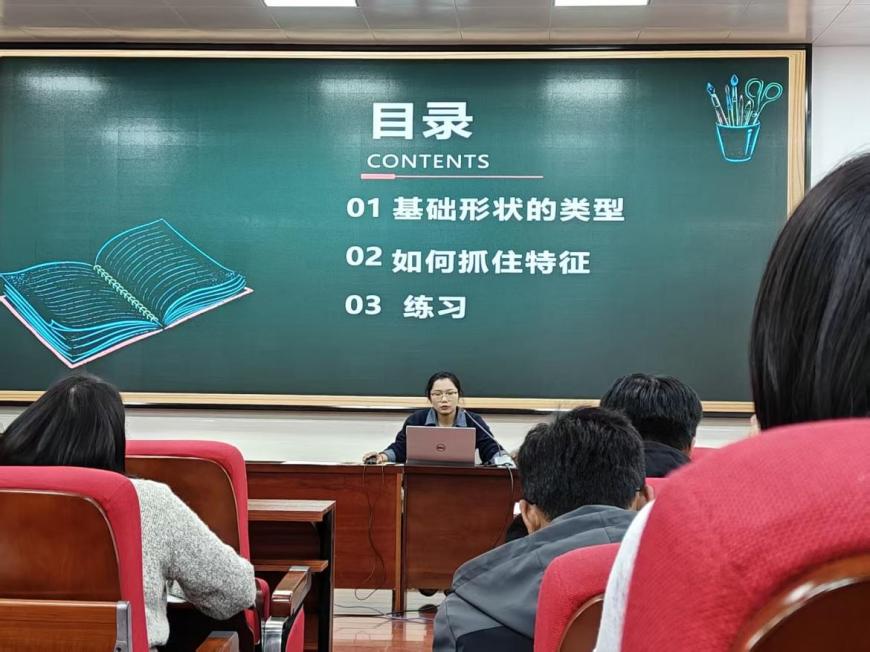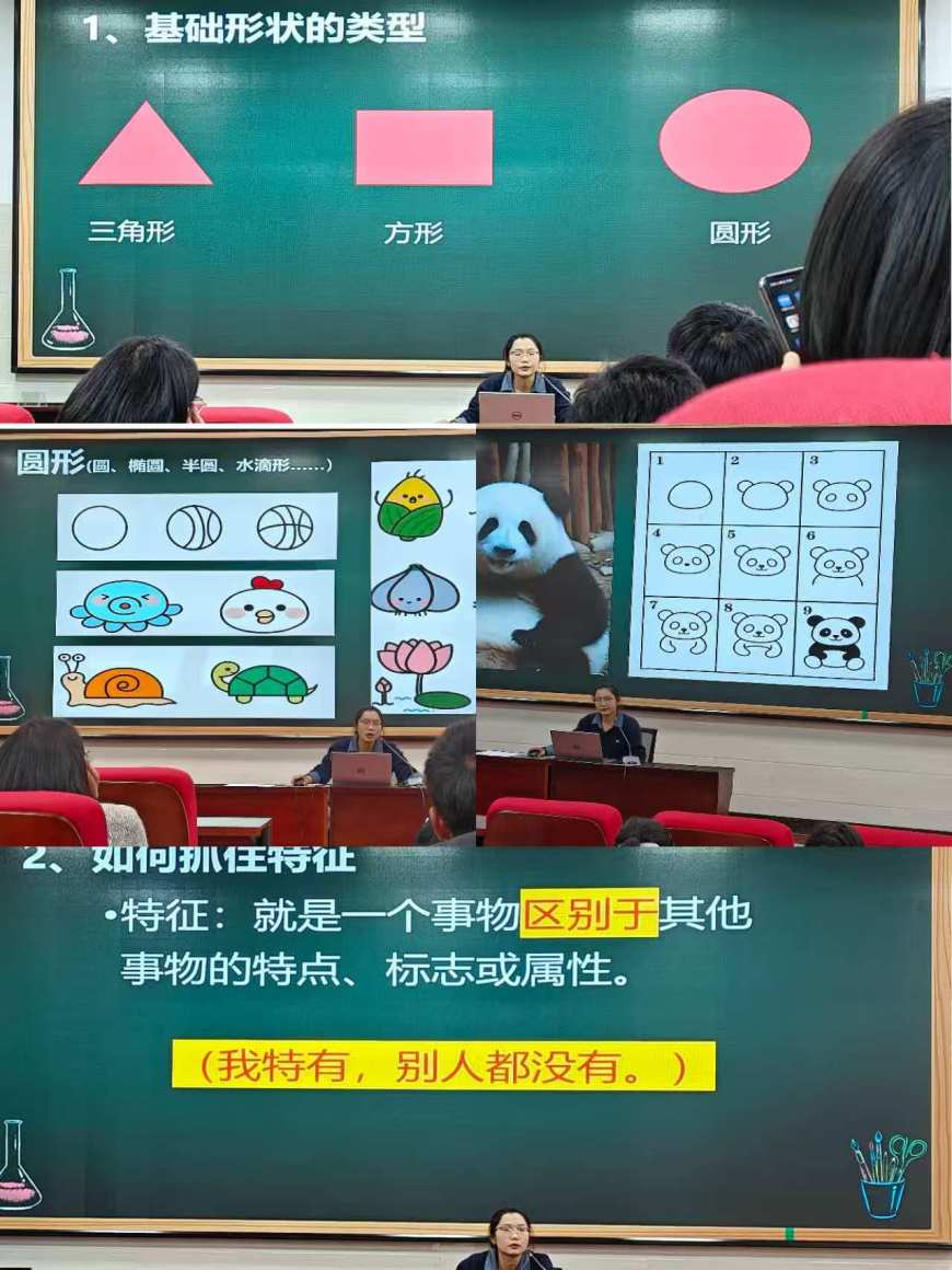 本次培训以“简笔画——以形概型”为主题,聚焦小学课堂实用简笔画技巧,为新教师搭建系统学习与实操提升的平台。培训伊始,张晓凤老师以清晰的逻辑框架,从“基础形状的类型”“如何抓住特征”“实操练习” 三个维度展开讲解,帮助新教师建立简笔画创作的核心思路。